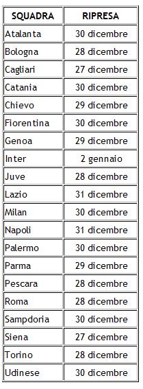 Dopo il “rompete le righe” di ieri, ecco le date di ritrovo dei club di Serie A. Le prime a riprendere gli allenamenti sono Cagliari e Siena: appuntamento il 27 dicembre ad Assemini e Colle val d’Elsa. L’ultima sarà l’Inter, che prolungherà le vacanze fino al 2 gennaio.