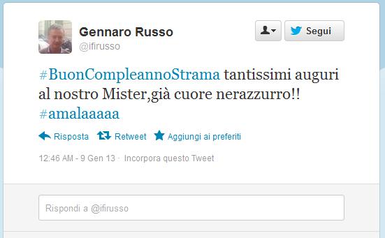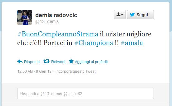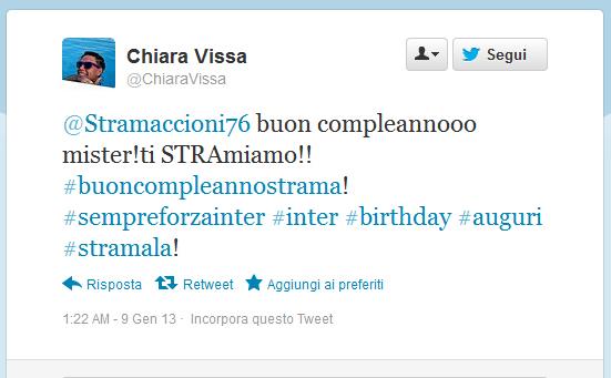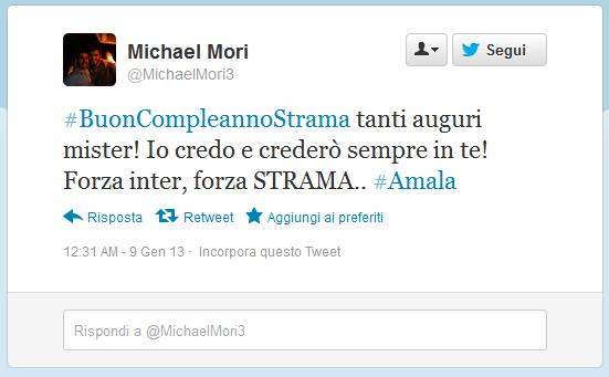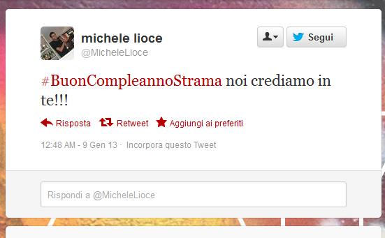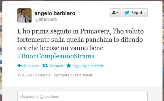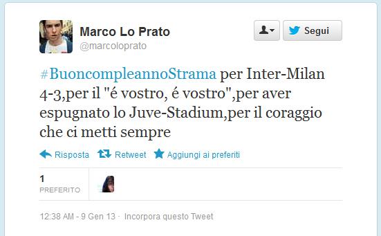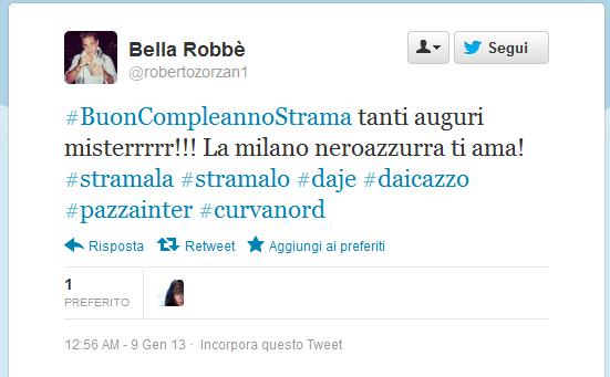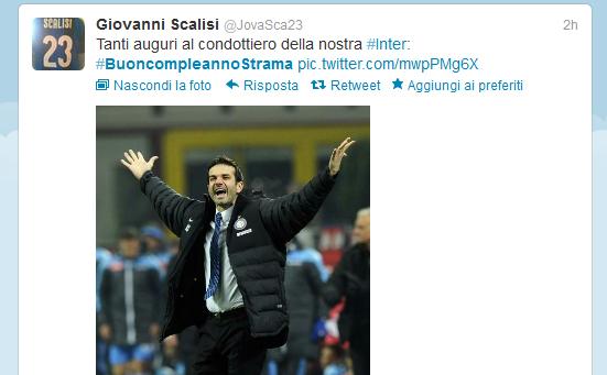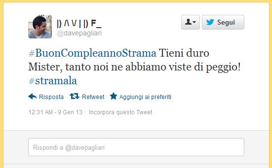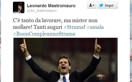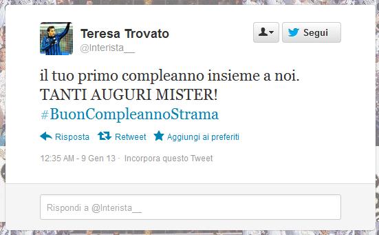 E’ ad Appiano da poco più di un anno e mezzo, ma grazie al suo modo di fare e alle sue capacità è già riuscito a conquistare il cuore di tutti gli interisti. Oggi, mercoledì 9 gennaio 2013, Andrea Stramaccioni compie 37 anni e si prepara a festeggiare il suo primo compleanno da allenatore dell’Inter. Un giorno speciale, che i tifosi hanno voluto celebrare facendo i loro auguri al mister su Twitter, dove l’hashtag #BuonCompleannoStrama ha fatto registrare in poche ore un numero impressionante di messaggi. Eccone alcuni:
