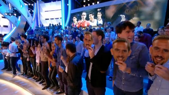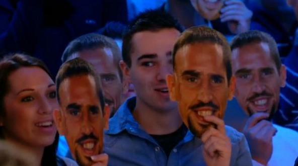 Al Santiago Bernabeu la scorsa settimana 45.000 tifosi si erano mascherati da CR7 per lanciare il portoghese nella corsa al Pallone d’Oro. In Francia hanno deciso di ‘rispondere’. Durante una trasmissione di Canal Plus nel quale era ospite il campione del Bayern Monaco, tutto il pubblico presente ha indossato la maschera del proprio beniamino. Beniamino che è rimasto visibilmente imbarazzato e contento allo stesso tempo.