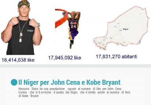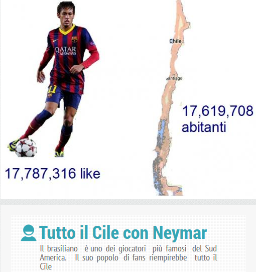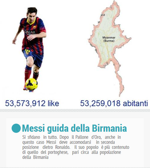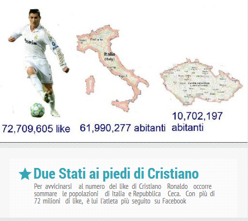 Se oggi la popolarità si misura con il tasto mi piace, allora loro, i dieci atleti più seguiti su Facebook, hanno un seguito grande come Stati. Con i suoi 72 milioni di like, Cristiano Ronaldo è in cima a questa classifica. Il suo è un vero e proprio popolo: per fare un confronto occorre sommare gli abitanti di Italia e Repubblica Ceca. Ecco allora a quali nazioni corrispondono i fans degli sportivi più social del mondo.