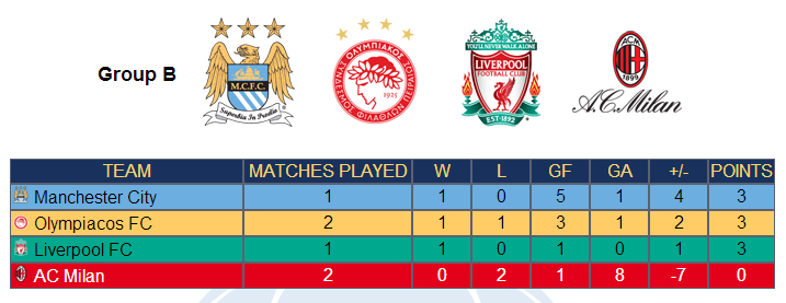 Il gruppo B invece, al momento vede Manchester City, Olympiacos e Liverpool a 3 punti. A quota 0 invece, in fondo alla classifica, rimane il Milan.