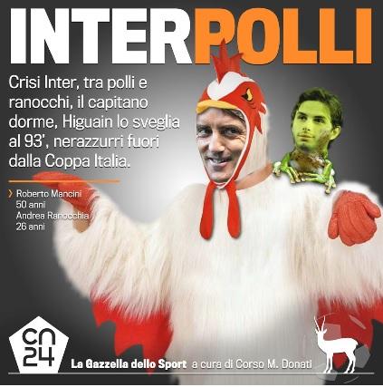 “Non so cosa dire. Non ho parole. Non si può prendere un gol così. Siamo dei polli, abbiamo giocato bene ma siamo dei polli”. Le parole di Mancini ieri sera in mixed zone dopo il flop all’ultimo respiro in Coppa Italia contro il Napoli hanno scatenato l’ironia del web, con i tifosi che hanno reinterpretato così il commento dell’allenatore.