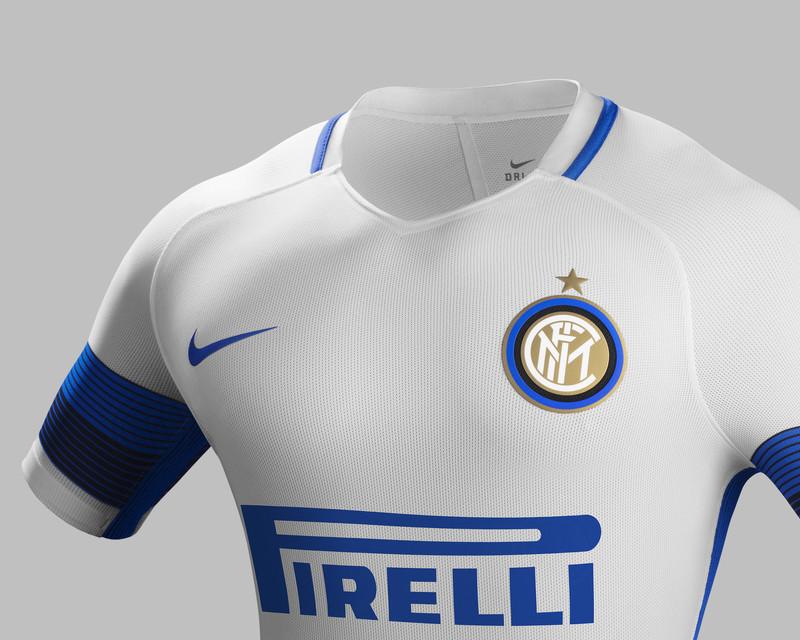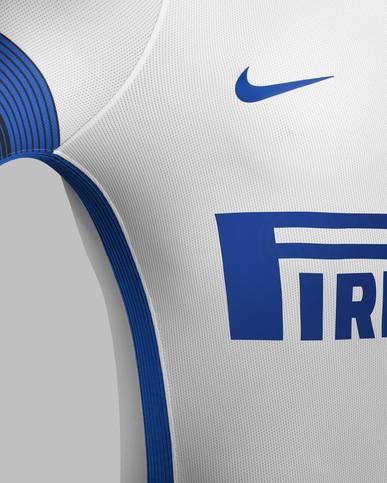 Per quanto riguarda l’Away Kit, “la celebre banda nerazzurra – presente in molte storiche divise del passato – è stata quest’anno posta sulle maniche e reinterpretata in chiave moderna: la metà nera della banda presenta un finissimo gessato blu, mentre la metà blu è caratterizzata da un finissimo gessato nero. Le maniche e le spalle sono bianche, ma in un panel separato per enfatizzarne il movimento dei calciatori“. La maglia presenta uno scollo a V e sul retro una striscia sfumata, nonché la scritta “INTER” sulla parte posteriore del colletto. Anche qui la striscia laterale garantisce maggiore ventilazione al giocatore in movimento.