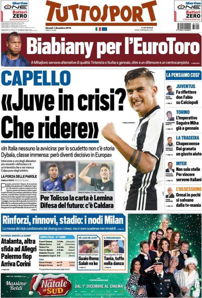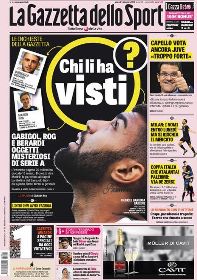 Mistero Gabigol in prima pagina sulla Gazzetta dello Sport del primo dicembre. “Chi li ha visti?“, così la rosea titola per quei giocatori finiti fuori dai radar della Serie A. Tuttosport consiglia i nerazzurri: “Non solo stelle, per vincere servono italiani”. Il Corriere dello Sport studia le mosse Inter per Messi: “Messi-Inter, ecco perchè si può fare”