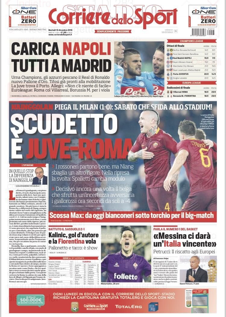 Il Corriere dello Sport si concentra così come la rosea sul duello scudetto Roma-Juve, decretato dopo il posticipo contro il Milan. Spazio anche all’altro posticipo in cui la Fiorentina ha battuto il Sassuolo grazie a Kalinic. Un occhio di riguardo il quotidiano romano ce l’ha per il Napoli che, insieme alla Juventus, ha conosciuto l’avversaria negli ottavi di Champions. I partenopei hanno pescato il Real Madrid mentre i bianconeri il Porto. Infine, spazio all’ItalBasket che è speranzosa nelle mani di Ettore Messina.