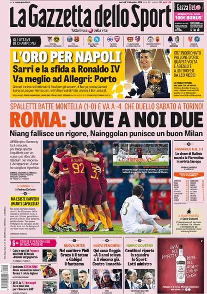 La Gazzetta Dello Sport si concentra principalmente sul posticipo fra Roma e Milan, partita che lancia i giallorossi come unica vera Anti-Juve e ferma momentaneamente il miracolo rossonero. Spazio anche ai sorteggi di Nyon di Champions ed Europa League ed al pallone d’oro Cristiano Ronaldo. Menzione per l’Inter di Pioli in costruzione che ha in Brozovic il suo talismano ed in Gabigol il suo fantasma.