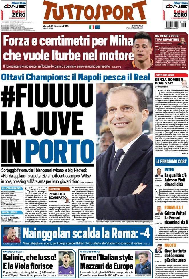 TuttoSport enfatizza invece l’urna discretamente benevola che ha sorteggiato il Porto ai bianconeri. Spazio anche alla Roma che vince il posticipo e salendo a -4 dai bianconeri cerca di mettere pressione. Piccolo trafiletto dedicato anche a Walter Mazzarri ed al suo Watford che sorprendono in terra inglese agguantando addirittura la zona europa in Premier. Menzione anche per l’Inter in ripresa: la qualità c’è, ora Mister Pioli deve regalare la solidità necessaria.