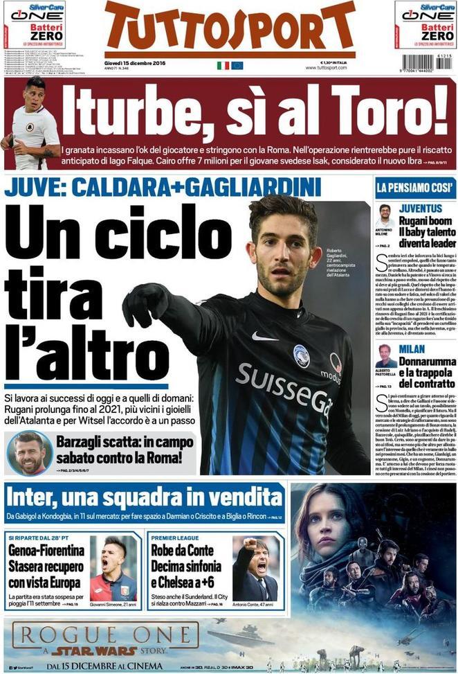 Tutto Sport apre con una notizia non nuova. La squadra nerazzurra, o comunque buona parte, è in vendita. Infatti si legge: “Inter una squadra in vendita. Da Gabigol a Kondogbia, in 11 sul mercato per far spazio a Darmian o Criscito e Biglia o Rincon”. Insomma ci si proietta già al mercato.