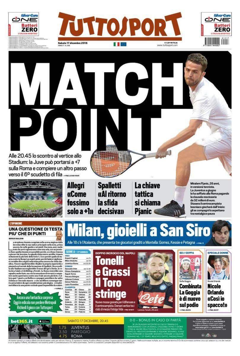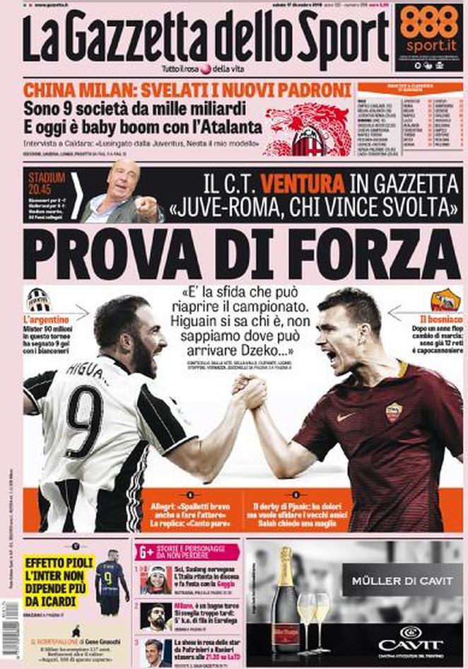 Tuttosport invece dedica buona parte della sua prima pagina alla partita tra Juventus e Roma e anche al mercato del Torino e del Milan, che vedrà da vicino nel match contro l’Atalanta tre obiettivi, ovvero Gomez, Kessiè e Petagna.
