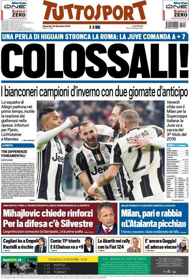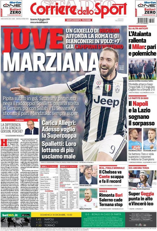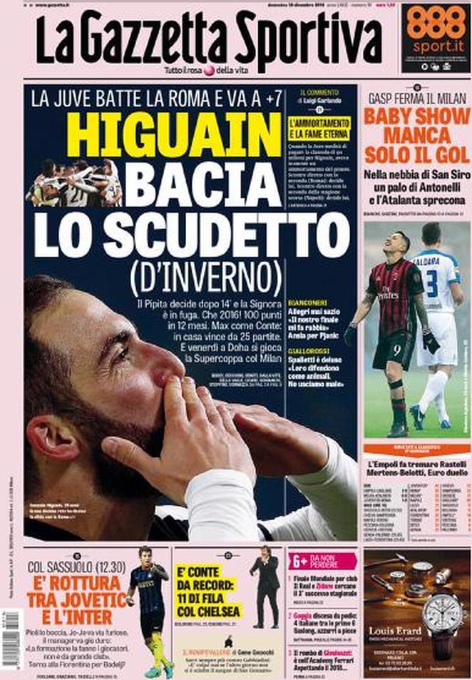 TuttoSport dedica la prima pagina alla soffertissima vittoria bianconera sulla Roma che porta la Juve a +7 sui giallorossi. Anche il Corriere dedica la prima alla partitissima scudetto. Evidenziando come Higuain abbia rappresentato la maggiore differenza in campo tra le due squadre.