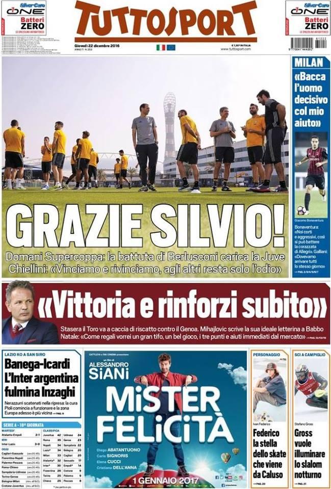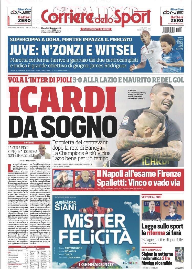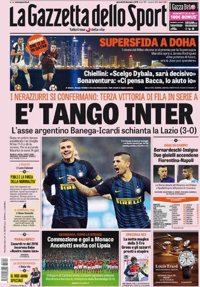 TuttoSport si concentra sull’Inter argentina che ha fulminato la Lazio a San Siro. Inter argentina visti i gol siglati da Banega ed Icardi e la zona Europa sempre più vicina. La Gazzetta dello Sport titola ‘E’ tango Inter’, anch’essa quindi parla del binomio argentino che ha permesso la vittoria dell’Inter. Il Corriere dello Sport scrive di un Icardi da sogno.