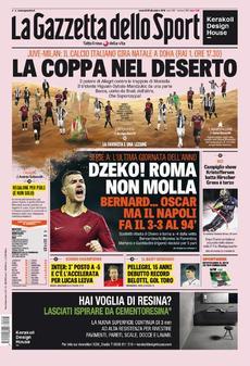 La Gazzetta dello Sport apre concentrandosi sul turno infrasettimanale appena conclusosi: titolo principale dedicato alla Roma che cerca di restare aggrappata al treno bianconero ed al Napoli che invece impatta contro la Fiorentina di un grande Bernardeschi. Spazio anche alla Supercoppa italiana ed al mercato dell’Inter, data su Lucas Leiva ed ormai in zona Champions grazie alla combinazione di risultati. Cenno anche al giovane recordman Pellegri.