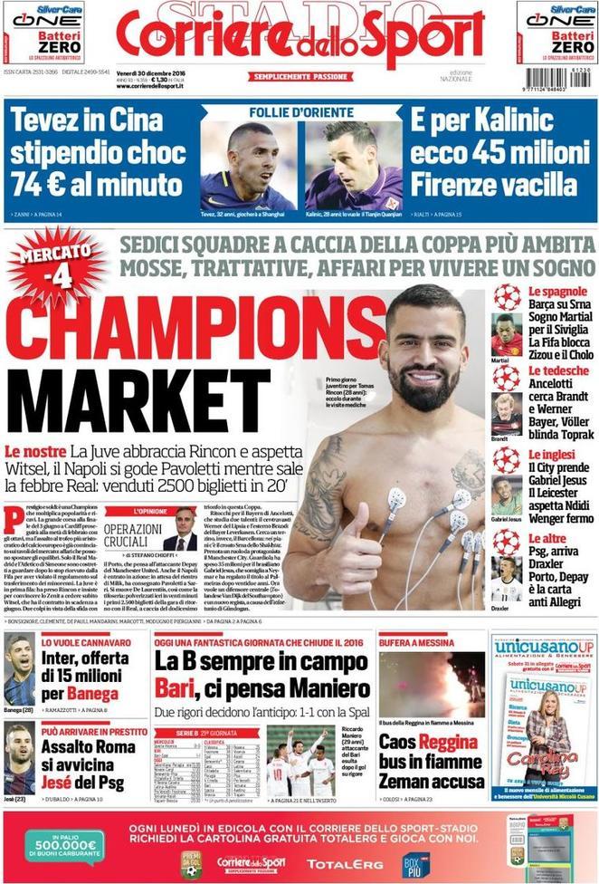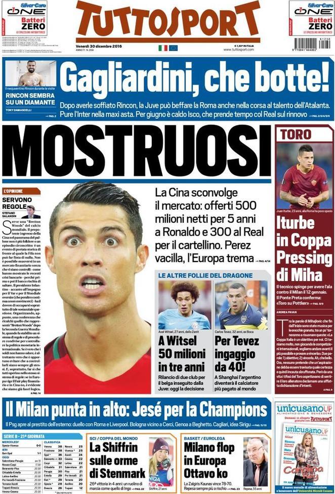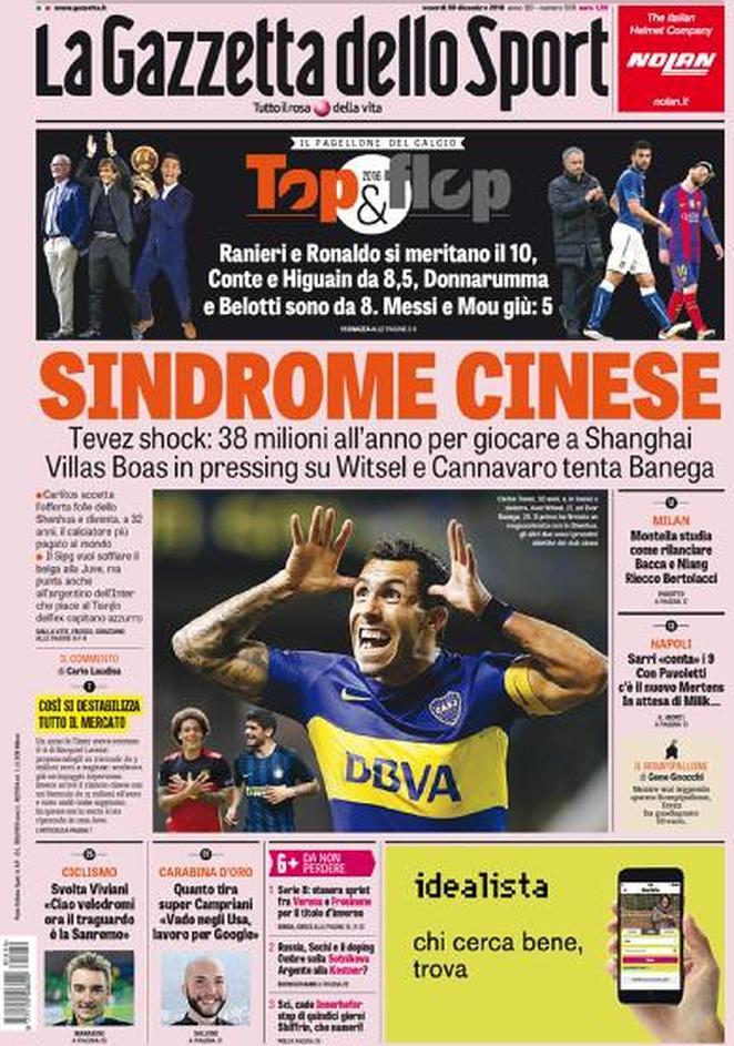 Anche la Gazzetta dello Sport apre parlando delle “Furie” cinesi, che con le loro offerte colossali rischiano di destabilizzare tutto il mercato mondiale. Tevez, Witsel, Banega e CR7 sono solo alcuni degli obbiettivi dei nuovi giganti economici del calcio. La rosea valuta anche tutti i personaggi principali del pallone in questo 2016, bocciando Mou e Messi e dando un meritato 10 a Claudio Ranieri.