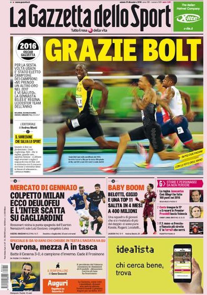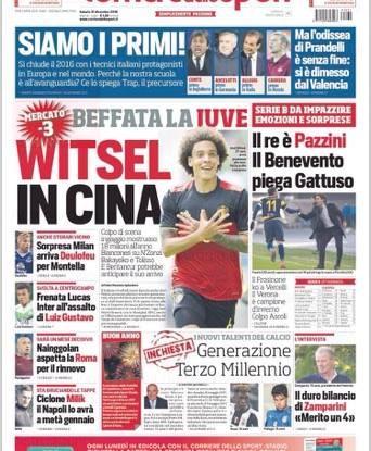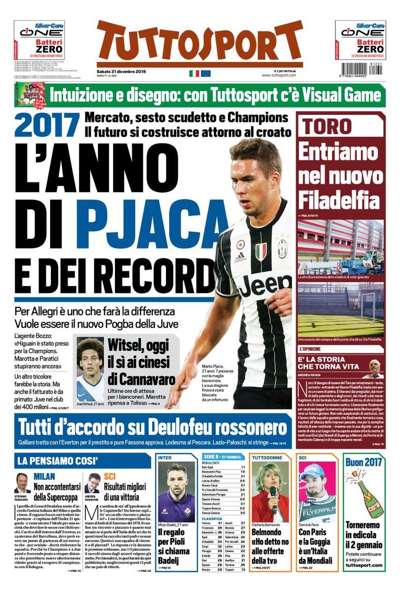 Buona parte della prima pagina di Tuttosport viene dedicata a Pjaca, con il 2017 che potrebbe essere l’anno della sua consacrazione. Witsel, uno degli obiettivi dei bianconeri, non andrà alla corte di Allegri: per il belga pronto il passaggio in Cina alla squadra di Cannavaro. Per quanto riguarda l’Inter, invece, secondo il quotidiano torinese il regalo per Pioli sarà Badelj, centrocampista attualmente in forza alla Fiorentina. Sempre restando in tema mercato, ormai tutto fatto per il trasferimento in prestito di Deulofeu al Milan.
