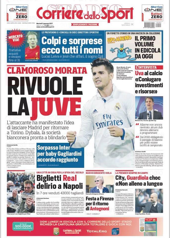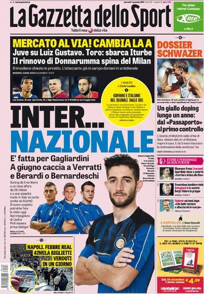 La prima pagina di TuttoSport si concentra su Gagliardini e l’Inter. I nerazzurri fanno il loro colpo per il mercato di gennaio. 30 milioni sul piatto per il giocatore dell’Atalanta. Anche il Corriere dello Sport si concentra su Gagliardini e l’accordo raggiunto con il club interista. La Gazzetta dello Sport parla di un Inter Nazionale. Fatta per Gagliardini, a giugno si punteranno altri Azzurri.