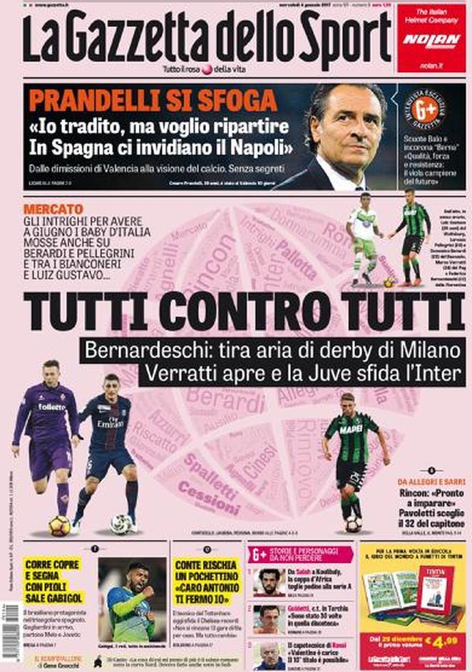 La Gazzetta dello Sport apre invece parlando delle probabili sfide di mercato fra le grandi italiane. Duelli fra Inter e Milan per Bernardeschi e fra bianconeri e nerazzurri per Verratti e Luis Gustavo. Citato anche Gabigol, in goal nel triangolare di Marbella.
