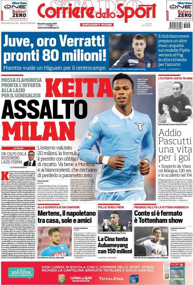 Nessuna notizia relativa all’Inter, invece, nella prima pagina del Corriere dello Sport, ma due notizie che riguardano indirettamente i nerazzurri. Il Milan, infatti, è partito all’assalto di Keita Balde, nome presente anche sulla lista di Piero Ausilio. Altro nome certamente più scottante è quello di Marco Verratti, che avrebbe invece ricevuto un’offerta dalla Juventus. Secondo il quotidiano, i bianconeri avrebbero pronta un’offerta di 80 milioni per assicurarsi l’ex Pescara.