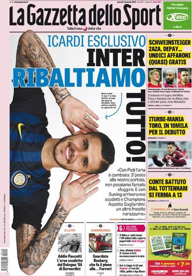Nella rassegna stampa di oggi, spicca in prima pagina della Gazzetta dello Sport un’intervista al capitano nerazzurro Mauro Icardi. Come afferma l’attaccante argentino, l’Inter con Pioli ora può puntare al terzo posto. I nerazzurri devono credere all’obiettivo Champions League. Icardi crede in Suning e sa che arriveranno dei trofei. Infine, investitura importante per Roberto Gagliardini. Arriva un altro fratello nerazzurro. Ma Tuttosport, in prima pagina, parla di ombre cinesi. Riguardo l’Inter, c’è un’improvvisa frenata nella trattativa per il centrocampista atalantino. Il club di Gasperini, infatti, chiede garanzie al club nerazzurro.