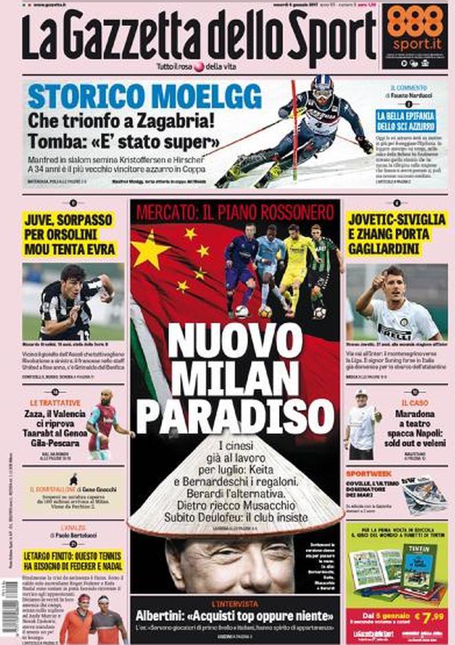 Sulla prima pagina della Gazzetta dello Sport spazio al mercato dell’Inter, sia in entrata che in uscita. Per quanto riguarda le cessioni, Jovetic è ormai ad un passo dal Siviglia. Sempre calda la trattativa per Gagliardini, che si sbloccherà con l’arrivo a Milano di Zhang la prossima settima. Sempre sulla rosea ampio spazio anche al mercato del nuovo Milan cinese: tanti i nomi nel mirino, da Berardi a Bernardeschi fino a Musacchio. Presente anche il mercato della Juve, con i bianconeri che hanno sorpassato tutti per Orsolini, mentre Evra potrebbe tornare al Manchester United.