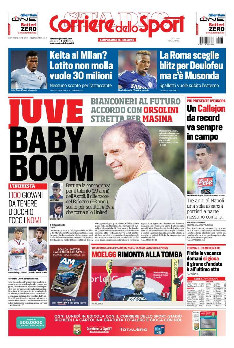 Nessuna traccia di Inter invece sulla prima pagina del Corriere dello Sport, dedicata in buona parte alla Juventus vicina a chiudere per Orsolini e Masina. Il Milan ha fatto un sondaggio per Keita, ma Lotito chiede 30 milioni. Spazio infine anche al mercato della Roma, che ha fatto un blitz per Deulofeu, ma che ha messo gli occhi anche su Musonda.