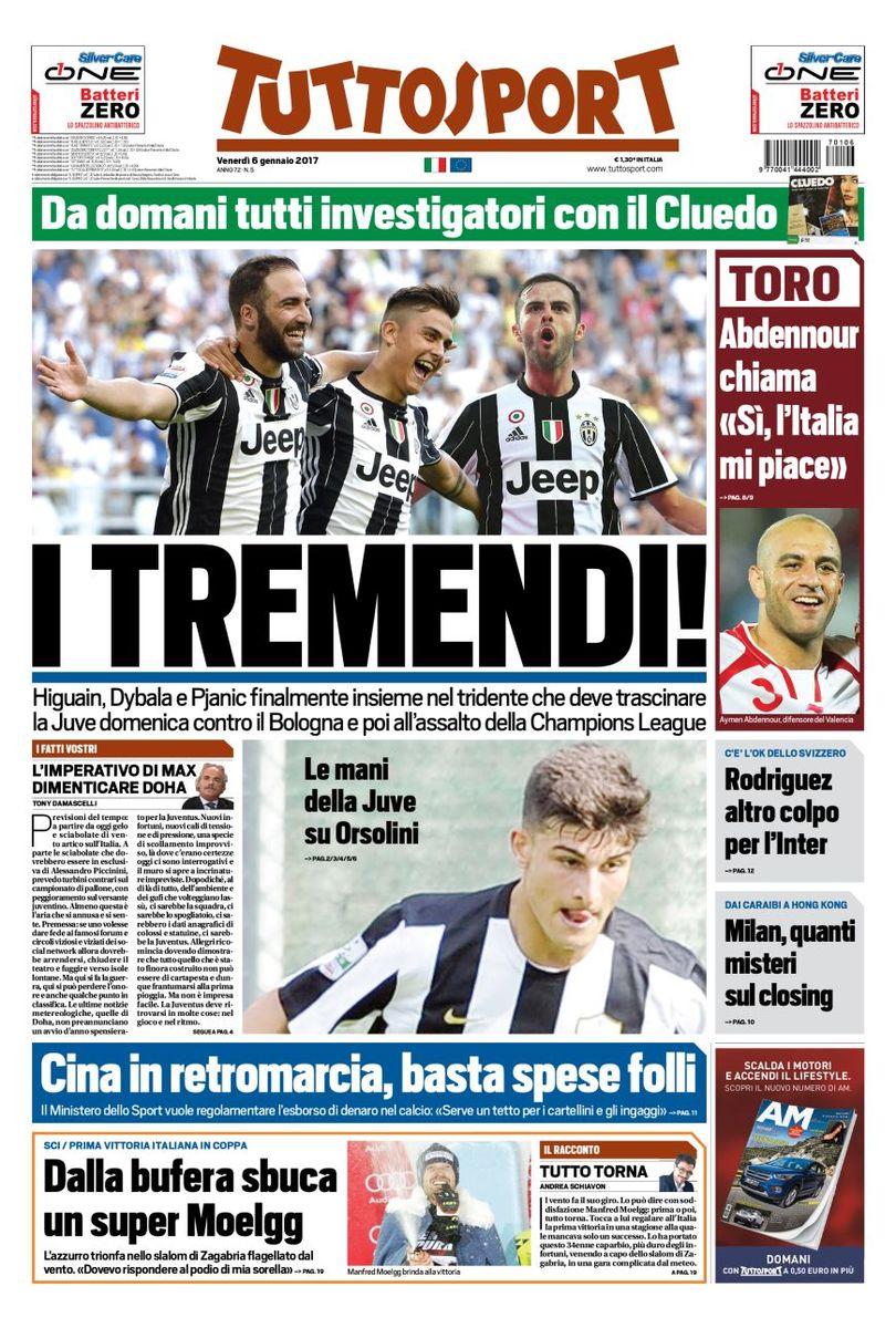 Anche Tuttosport dedica parte della sua prima pagina al mercato dell’Inter: Ricardo Rodriguez potrebbe essere un nuovo rinforzo nerazzurro. Come consuetudine il quotidiano torinese si sofferma in particolar modo sulle vicende della Juventus e del Torino, con i bianconeri che hanno messo le mani su Orsolini, mentre ai granata piace Abdennour. Per quanto riguarda il Milan, invece, prosegue il mistero intorno al closing con i cinesi.
