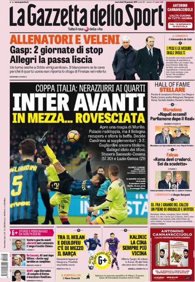 La Gazzetta dello Sport apre parlando della vittoria sofferta ma meritata dell’Inter sul Bologna in Coppa Italia con il meravigliso goal di Murillo. Spazio anche alla possibile partenza di Kalinic in Cina e ai veleni dietro ai verdetti del giudice sportivo. Citazione anche per le parole di Falcao, che giudica la Roma da scudetto.
