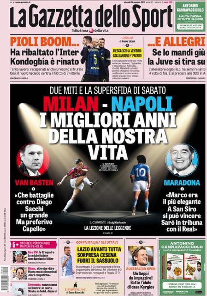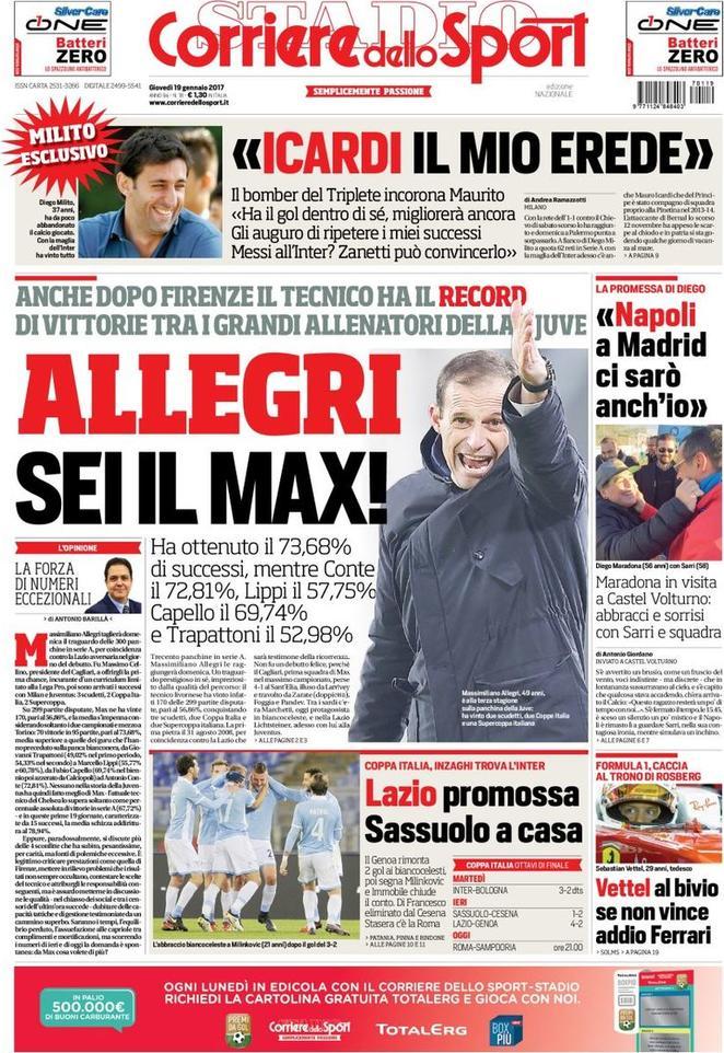 Le prime pagine dei principali quotidiani sportivi. Tuttosport, in prima pagina, suggerisce nuovi nomi per la difesa nerazzurra. Oltre a Manolas, obiettivo dichiarato nerazzurro, spuntano altri due nomi. Le novità sono Marquinhos del PSG e Lindelof del Benfica. Entrambi i giocatori potrebbero arrivare in nerazzurro a giugno. La prima pagina della Gazzetta dello Sport, invece, parla del cambiamento dei nerazzurri sotto la guida tecnica di Stefano Pioli. L’ex Lazio ha fatto rinascere l’Inter, anche attraverso la rinascita di giocatori come Geoffrey Kondogbia. Da possibile partente a punto fisso della formazione nerazzurra, il francese sembra aver iniziato una nuova stagione. Non solo l’ex Monaco, ma anche Brozovic e Murillo sembrano due giocatori diversi da quelli di inizio anno. E Gagliardini ora è pronto a far parte della Nazionale di Giampiero Ventura. Il Corriere dello Sport, invece, riporta un interessante intervista all’ex principe nerazzurro Diego Alberto Milito. Che, nell’intervista, incorona Mauro Icardi come suoe erede. Il numero 9 ha il gol nel sangue, ed ha ampi margini di miglioramento. La speranza è che possa ripetere le imprese del numero 22. Infine, una battuta in chiave mercato: Milito spera che Zanetti convinca Messi a vestire nerazzurro.