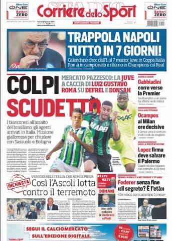 Il Corriere dello Sport invece, si concentra sul mercato che sta per finire. Roma e Juventus vogliono completare il roster per la corsa scudetto. I bianconeri spingono per Luiz Gustavo in mediana, la Roma a caccia di Defrel e Donsah. “Colpi scudetto. Mercato pazzesco”. Novità anche per il Napoli, con “Gabbiadini in uscita, e Milan, con Ocampos primo obiettivo”.