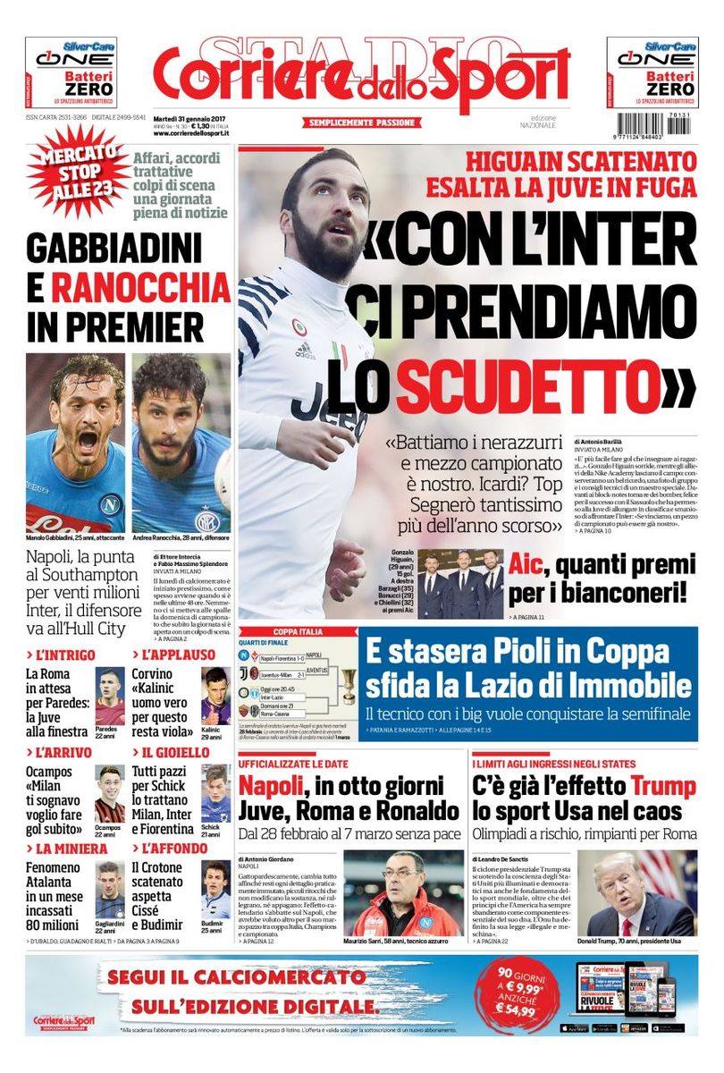 Il Corriere dello Sport dopo aver aperto con le dichiarazioni di Higuain che dice di volersi prendere lo scudetto proprio contro l’Inter, mette l’accento sul match di stasera: “E stasera Pioli in Coppa sfida la Lazio di Immobile. Il mister con i big vuole conquistarsi la semifinale”.