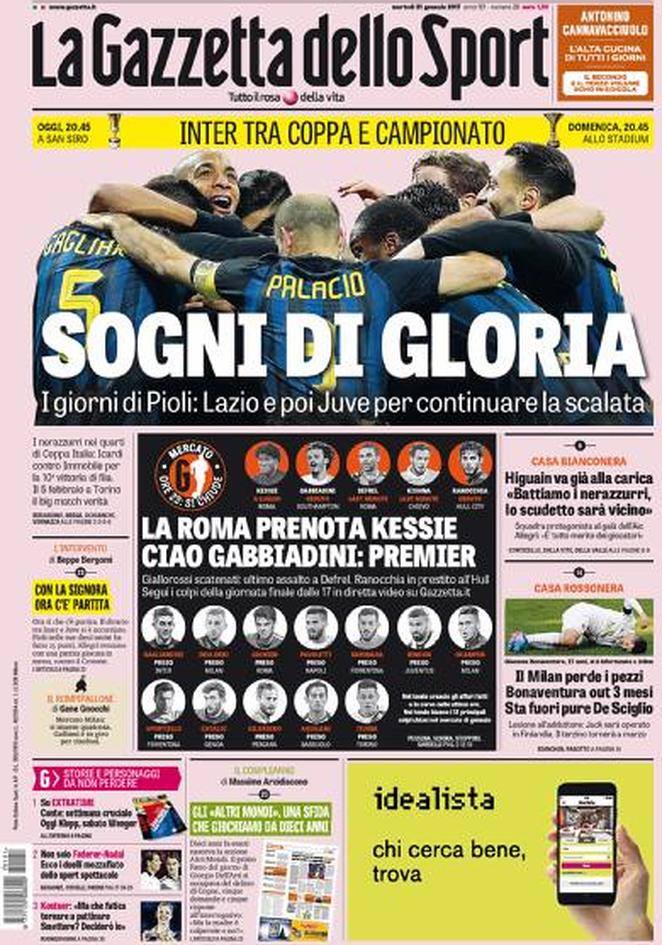 La Gazzetta dello Sport titola: “Sogni di gloria. Inter tra coppa e campionato”. La rosea sottolinea come siano “I giorni di Pioli: Lazio e poi Juve per continuare la scalata”.