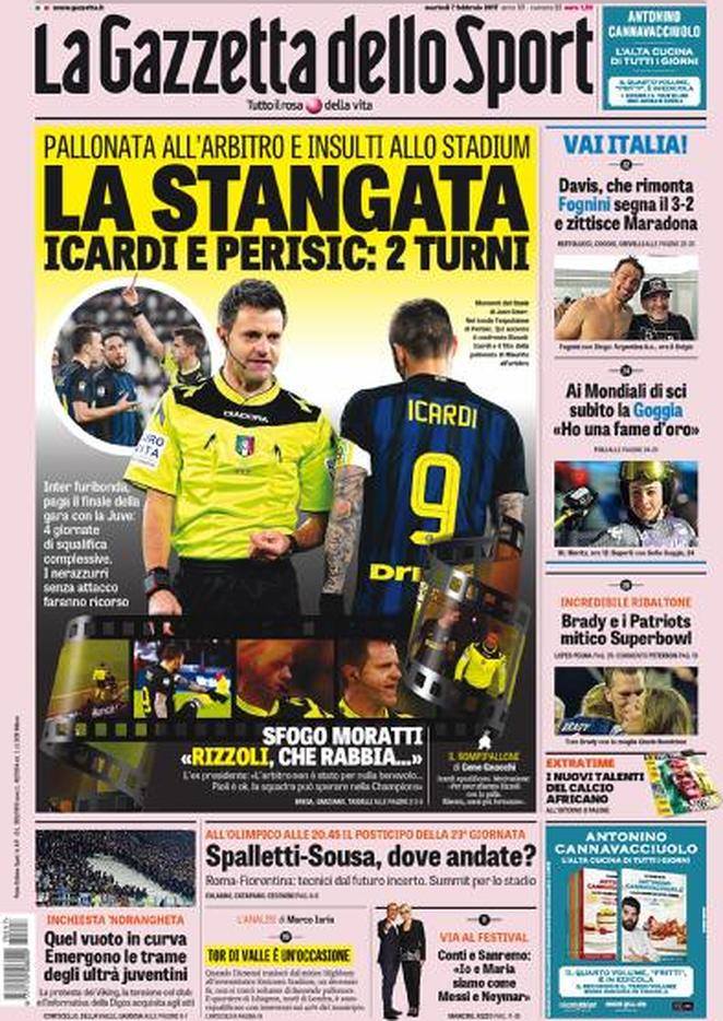 La Gazzetta dello Sport apre parlando della stangata subita dall’Inter, con Icardi e Perisic fuori due turni. Già scattato il ricordo dei nerazzurri. Spazio anche al mercato allenatori con Sousa e Spalletti con la valigia pronta.