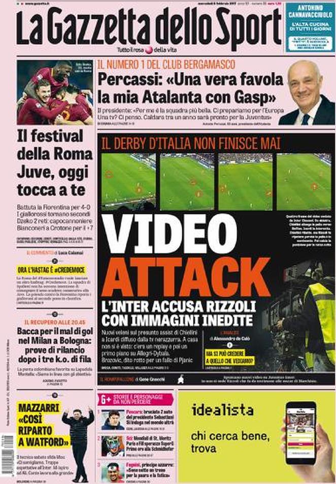 Di tutt’altra natura la prima pagina della Gazzetta dello Sport. L’Inter, infatti, avrebbe mosso nuove accuse verso Nicola Rizzoli, arbitro del Derby d’Italia. Dalle tribune dello Stadium, infatti, spunta un video che riguarda Chiellini e Icardi. Nel video, Chiellini compie un retropassaggio intercettato dal capitano dell’Inter. Il difensore, resosi conto dell’errore, alza il braccio, per far ripetere la rimessa in gioco. L’arbitro, naturalmente, asseconda Chiellini e fa ripetere il calcio di punizione. Infine, puntualizzazione riguardo l’infortunio di Brozovic: la causa sarebbe stata un fallo di Pjanic. La conseguenza è un dito rotto.