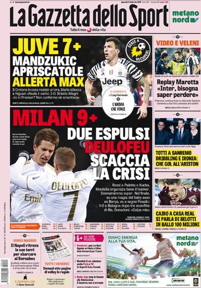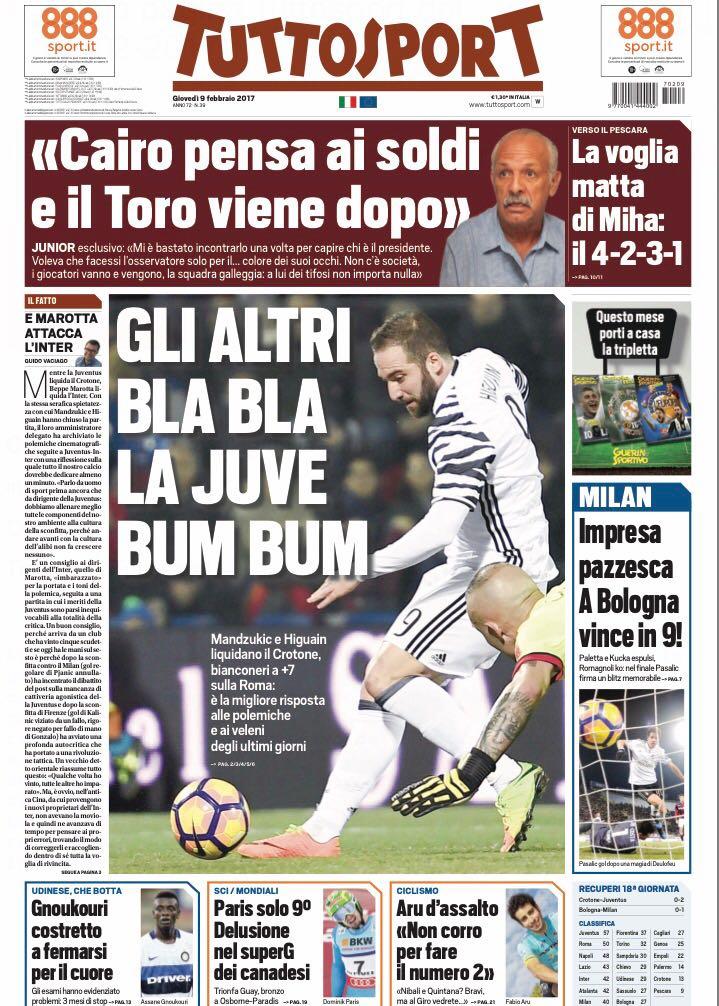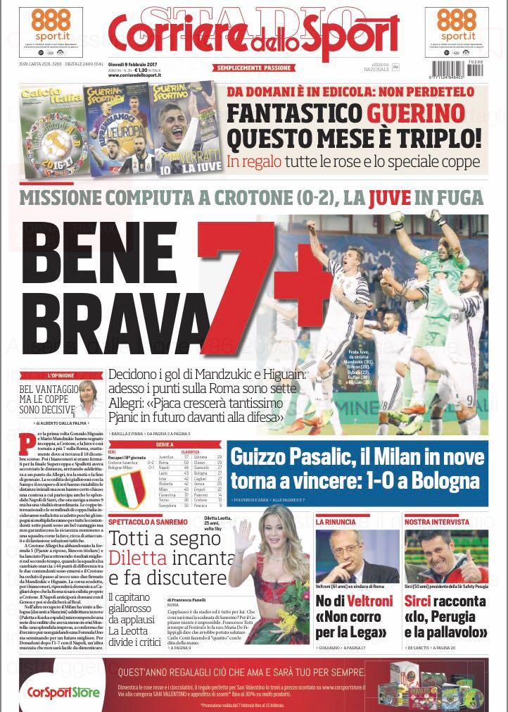 Il Corriere dello Sport infine non dedica l’apertura all’Inter si sofferma sempre sulle vittorie di Juventus e Milan: “Juve: bene, brava, 7+. Guizzo Pasalic, il Milan in 9 torna a vincere”. In taglio basso, invece, spazio alla seconda serata di Sanremo, che ha ospitato il capitano della Roma Francesco Totti.
