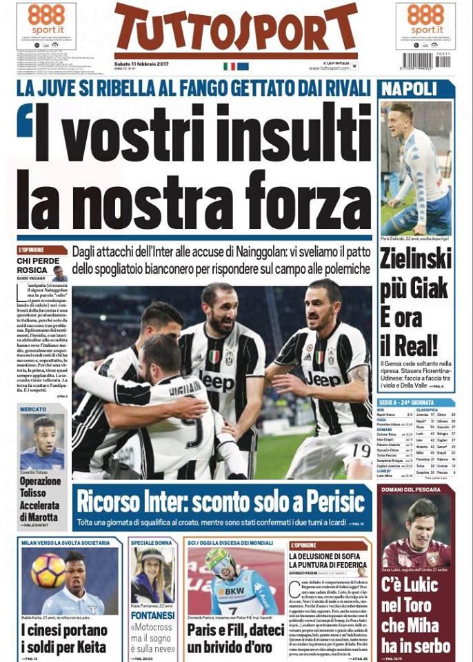 La prima pagina di Tuttosport è incentrata, ovviamente, sulla Juventus sotto attacco da diverse parti. Spazio anche all’Inter, con la squalifica ridotta di una giornata a Perisic mentre è rimasta invariata quella di Icardi. Il giornale torinese si sofferma anche sul Napoli, vittorioso contro il Genoa.