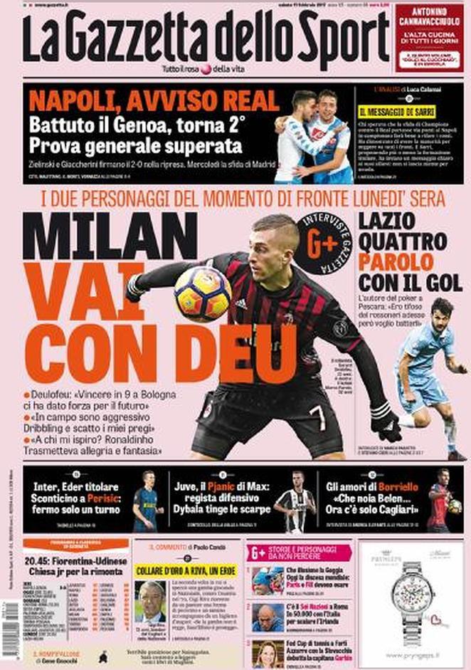 Sulla Gazzetta dello Sport ampio spazio alle interviste a Deulofeu del Milan e a Parolo della Lazio, due dei protagonisti del posticipo di lunedì tra rossoneri e biancocelesti. La rosea si sofferma anche sull’Inter, con Eder pronto a partire titolare contro l’Empoli al posto di Perisic a cui è stata ridotta di una giornata la squalifica. Anche su GdS, infine, si parla di Napoli e del successo ottenuto contro il Genoa.