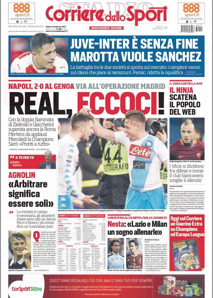 Il Corriere dello Sport si sofferma sul duello tra Inter e Juventus. Ma questa volta sul mercato, con le due squadre che si contendono Alexis Sanchez. Spazio ovviamente al Napoli che con la vittoria contro il Genoa è pronto ad affrontare il Real Madrid. Presente anche un’intervista ad Alessandro Nesta.