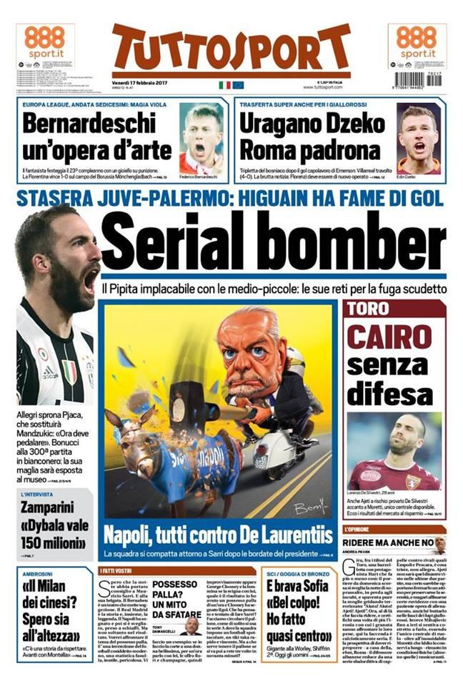 La prima pagina dell’odierno TuttoSport si concentra sul match di questa sera tra Juventus e Palermo, con un Higuain sempre più affamato di gol. Al Corriere dello Sport parla invece dell’intervista esclusiva fatta ad Insigne.