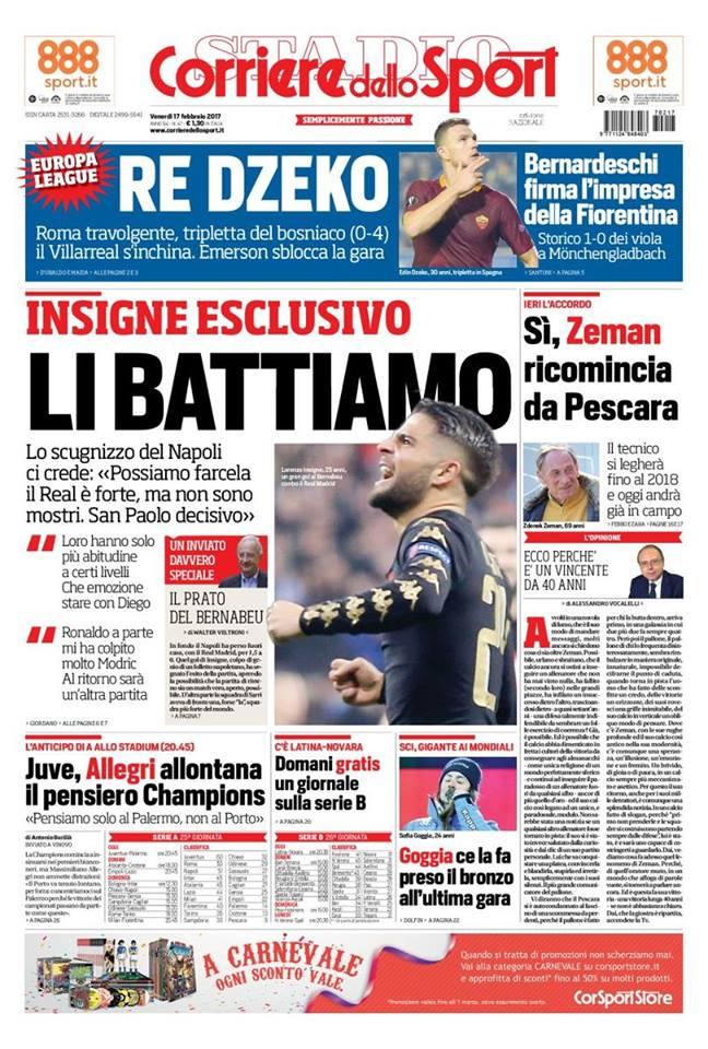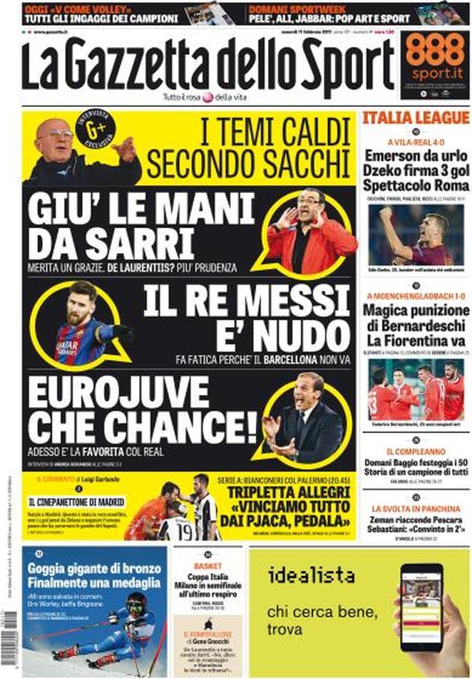 Niente Inter nemmeno sulla Gazzetta dello Sport, che invece si sofferma sulle polemica tra De Laurentiis e Sarri. Spazio anche alle imprese in Europa League di Roma e Fiorentina, alla Juve che giocherà contro il Palermo prima della sfida di hampions contro il Porto e al caso Messi: quando gioca male il Barcellona non va.