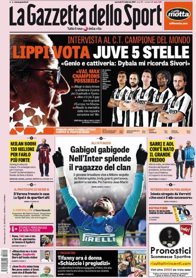 L’edizione odierna di TuttoSport in prima pagina tratta del ritmo dell’Inter con Pioli in panchina. Un ritmo da scudetto, e i punti guadagnati sono di più di quelli guadagnati da Mourinho. La Gazzetta dello Sport parla di Gabigol che gabigode. L’Inter si gode il suo talentino. Il Corriere dello Sport invece si occupa del fatto che le Big in Italia vincano più facilemente.