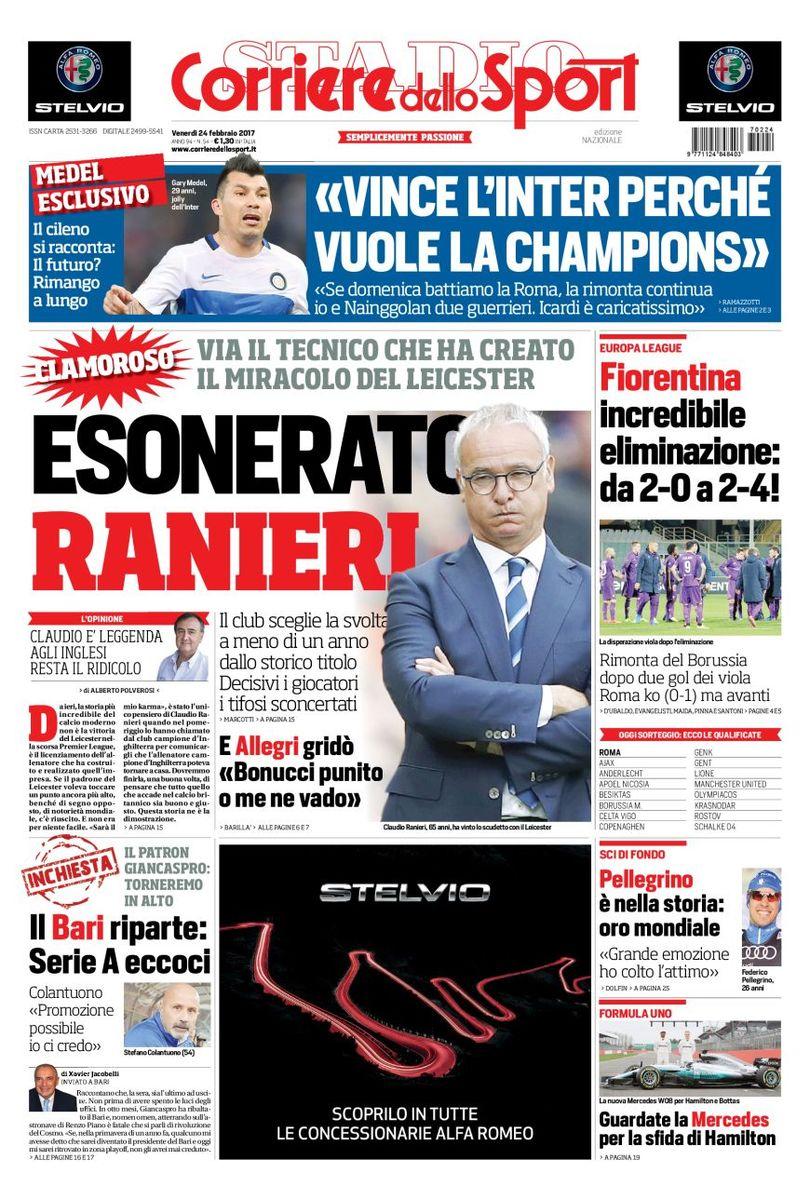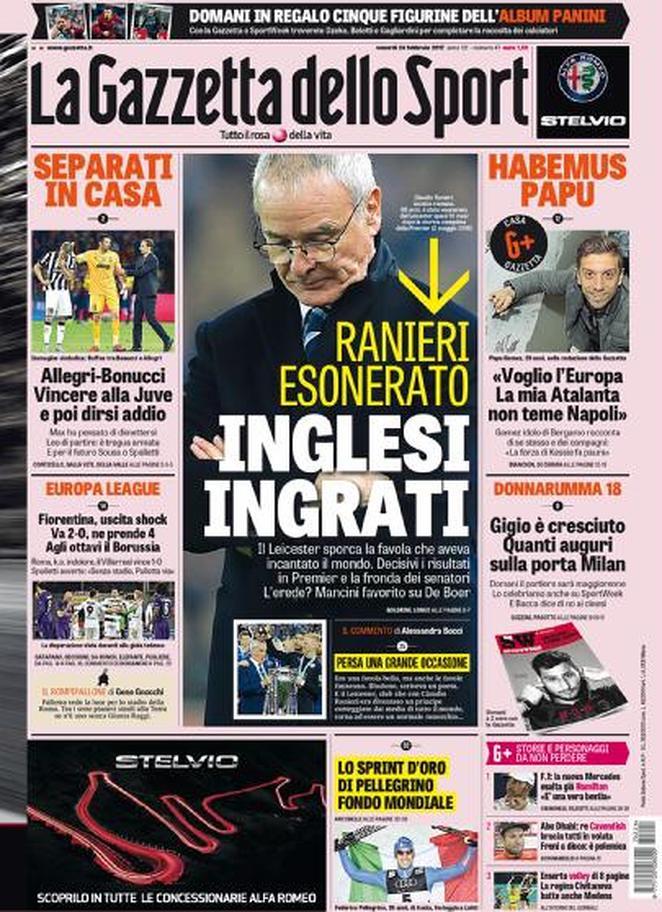 Nemmeno sulla prima pagina della Gazzetta dello Sport si può leggere una notizia sui colori nerazzurri. La rosea si occupa in principal modo dell’esonero di Ranieri (con Mancini favorito su de Boer per la successione), ma dedica spazio anche al caso Bonucci-Allegri. Spazio anche ad un’intervista al Papu Gomez, ai risultati di Europa League e ai 18 anni di Donnarumma.