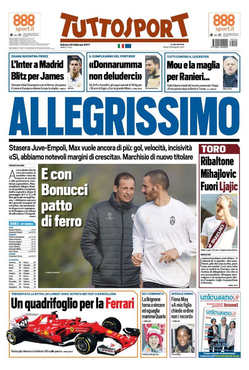 Rassegna stampa di oggi 25 febbraio che si apre con il Tuttosport. Il quotidiano torinese riporta del blitz di Zhang a Madrid, si parla di affari tra i presidenti, sopratutto ipotizzando per l’Inter l’occasione per avere James Rodriguez.