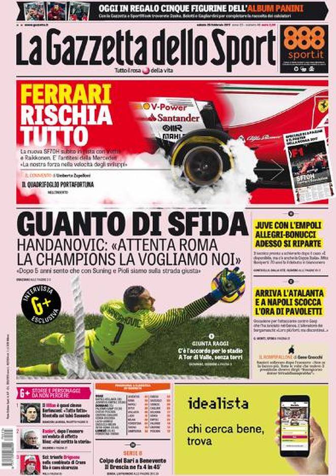 Handanovic invece si prende la prima pagina de La Gazzetta dello Sport: “Guanto di sfida, attenta Roma, la Champions la vogliamo noi”, in riferimento al big match di domenica che può servire all’Inter per alimentare i sogni Champions con il terzo posto.
