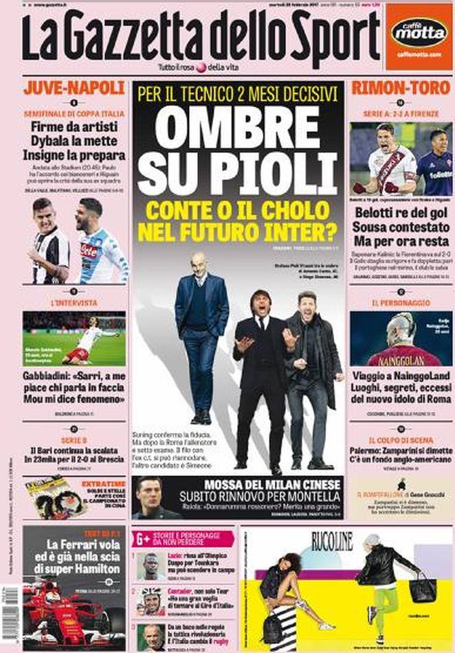La prima pagina dell’odierno TuttoSport si concentra su Pioli e sulla qualificazione in Champions. In caso questo non avvenisse Suning virerebbe su Conte o Simeone per la prossima stagione. Anche La Gazzetta dello Sport si occupa delle ombre sulla panchina di Pioli.