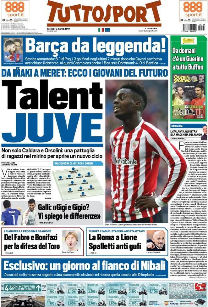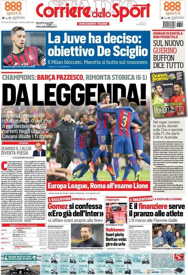 La prima pagina di Tuttosport non menziona in alcun modo i nerazzurri. Oltre alla storica impresa del Barcellona al ritorno degli ottavi di Champions, l’attenzione è tutta sui giovani in prospettiva futura. Tra le righe del Corriere dello Sport, invece, spunta un’intervista ad Alejandro Gomez. L’esterno dell’Atalanta, futuro protagonista a San Siro contro l’Inter, confessa di essere stato vicino ai nerazzurri. L’affare, però, è saltato proprio alla fine, lasciando il Papu a Bergamo.