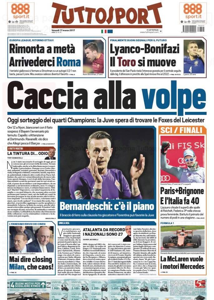 L’edizione odierna di TuttoSport si concentra su Bernardeschi, obiettivo nerazzurro che però tenta anche la Juventus. Il Corriere dello Sport invece scrive della Roma vincente per 2-1 in casa contro il Lione, un 2-1 che però non basta a passare il turno.