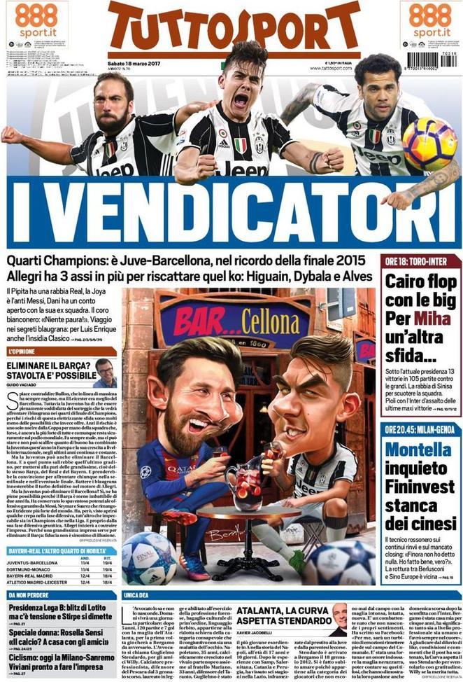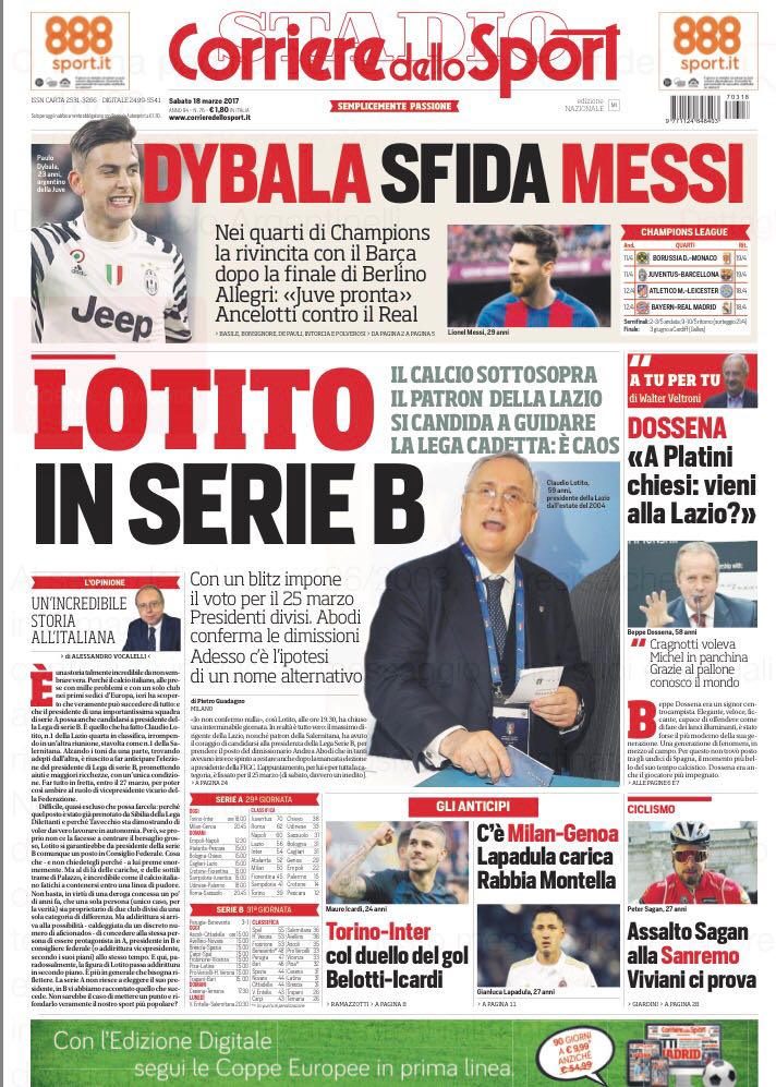 Il sorteggio di Champions ha dato la possibilità ai bianconeri di rivendicare la finale di Berlino di due anni fa. TuttoSport riporta infatti il titolo “I vendicatori” con le foto di Dani Alves (l’ex di turno), Dybala e Higuain. In secondo piano passa il match di oggi alle 18 tra Torino e Inter. Una sfida importante per Mihajlovic in cerca di riscatto contro le big. Il CdS invece si concentra sulla possibilità di Claudio Lotito come presidente della Lega cadetta. In vista invece dell’anticipo odierno, per il quotidiano romano è un duello del gol tra Belotti e Icardi.