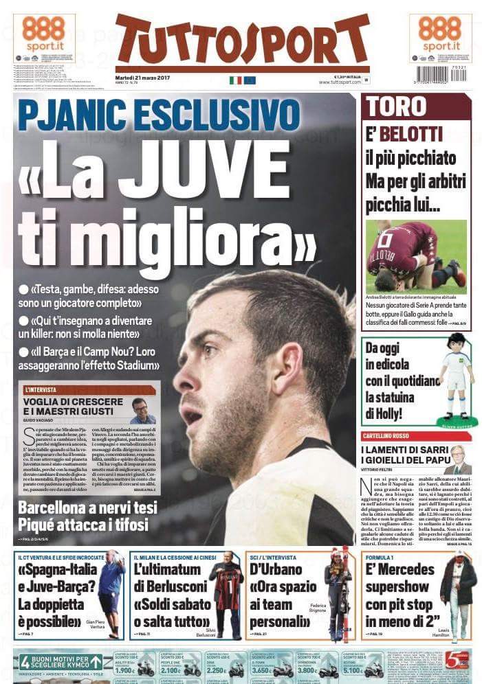 Tuttosport dedica la sua prima pagina all’intervista in esclusiva fatta a Miralem Pjanic. Trafiletto dedicato a Belotti che statistiche alla mano è il giocatore che subisce più falli in A. Articoli minori in prima pagina anche sulla Nazionale e sulla telenovela closing del Milan.