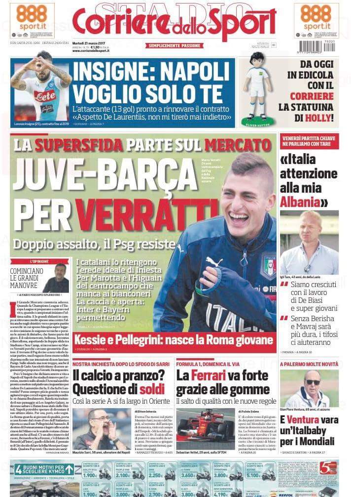 Il Corriere dello Sport infiamma gli animi dei tifosi bianconeri in vista della sfida contro il Barcellona svelando che i piemontesi se la vedranno con i catalani anche in sede di mercato per l’acquisto di Marco Verratti, sul quale però c’è anche la concorrenza di Inter e Bayern. Spazi dedicati sia in taglio alto che basso al Napoli, sui temi del rinnovo di Insigne e sulle parole di Sarri sui match alle 12.30, poche parole vengono anche date alla Formula 1 e alla nazionale dei giovani di Ventura.
