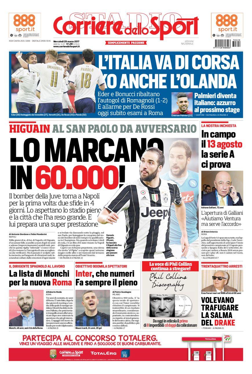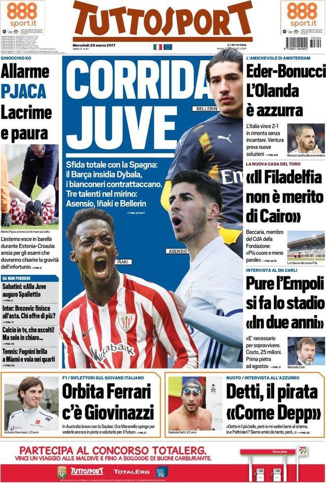 Nella serata di ieri l’Italia ha visto protagonisti per la sua vittoria in Olanda anche due nerazzurri quali Éder e Gagliardini. Per il primo soprattutto è stata una partita difficle da dimenticare, con il gol che ha siglato il pareggio immediato per gli azzurri. Nella prima pagina di TS però non si parla solo di nazionale e di mercato bianconero. Il quotidiano torinese infatti afferma che questa estate vi sarà un’asta per Brozovic. Molte sono le squadre interessate al croato nerazzurro; pertanto se lo aggiudicherà chi metterà sul piatto una cifra considerevole per strappare il centrocmapista all’Inter.