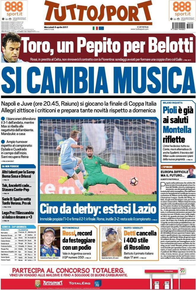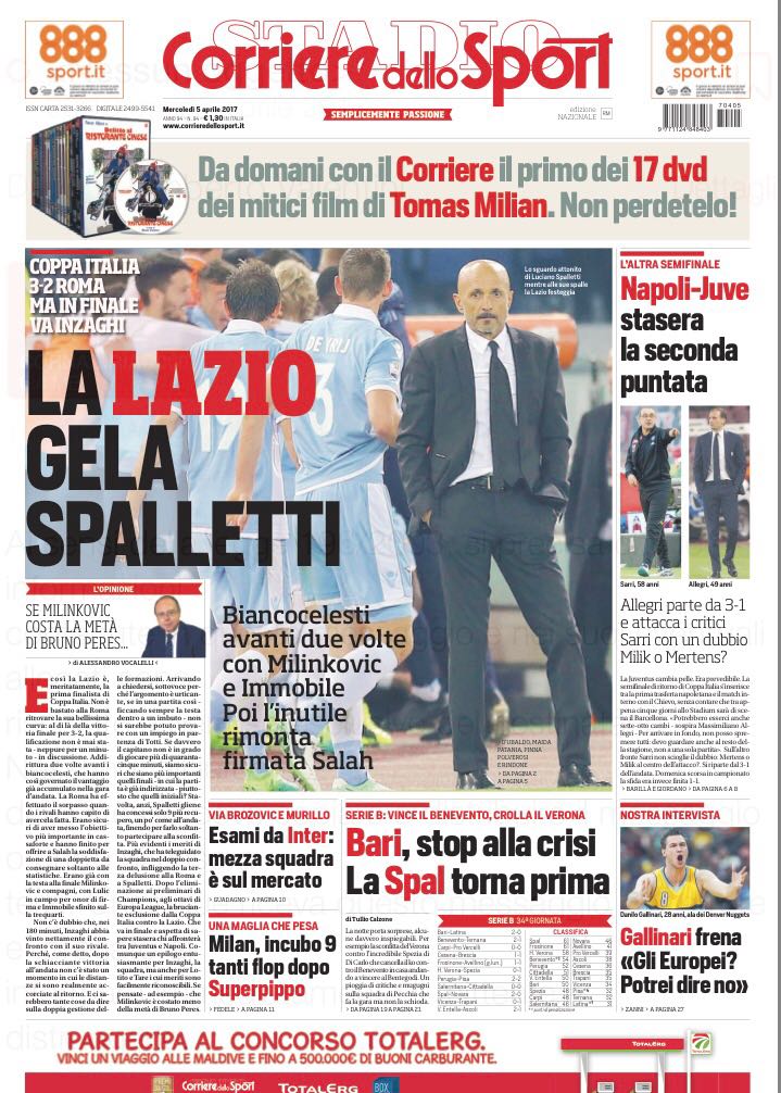 La prima pagina di Tuttosport si concentra sui piani dei nerazzurri per il futuro. A Champions svanita, si pensa alla prossima stagione. A cominciare dall’allenatore, ci saranno dei cambiamenti. Pioli, infatti, è già ai saluti: l’Inter vuole puntare tutto su Conte. Il tecnico del Chelsea è l’obiettivo numero uno per la panchina nerazzurra nella stagione 2017/2018. Il Corriere dello Sport, invece, non si concentra solo sull’allenatore, ma anche sui giocatori: nessuno è incedibile, mezza squadra è sul mercato. Tra i nerazzurri dati per partenti, ci sono Jeison Murillo, che ha perso il posto da titolare, e Marcelo Brozovic, che ha fallito l’ennesimo, e forse ultimo, esame di maturità in nerazzurro. Il croato, contro la Sampdoria a San Siro, ha fornito una prova deludente, causando entrambi i gol dei blucerchiati (tiene in gioco Schick sull’1-1, causa il rigore dell’1-2).